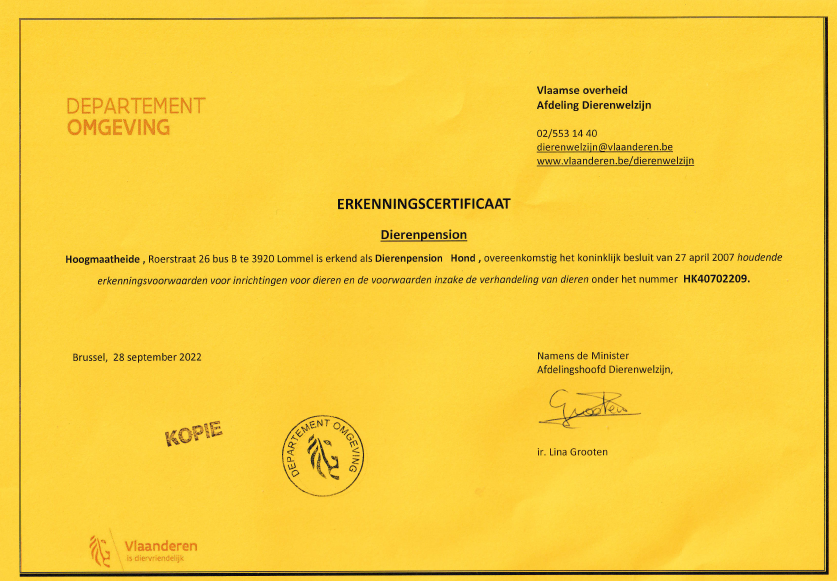 Erkenningsbewijs hondenpension uitgereikt door de Belgische Overheid